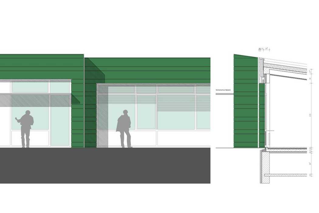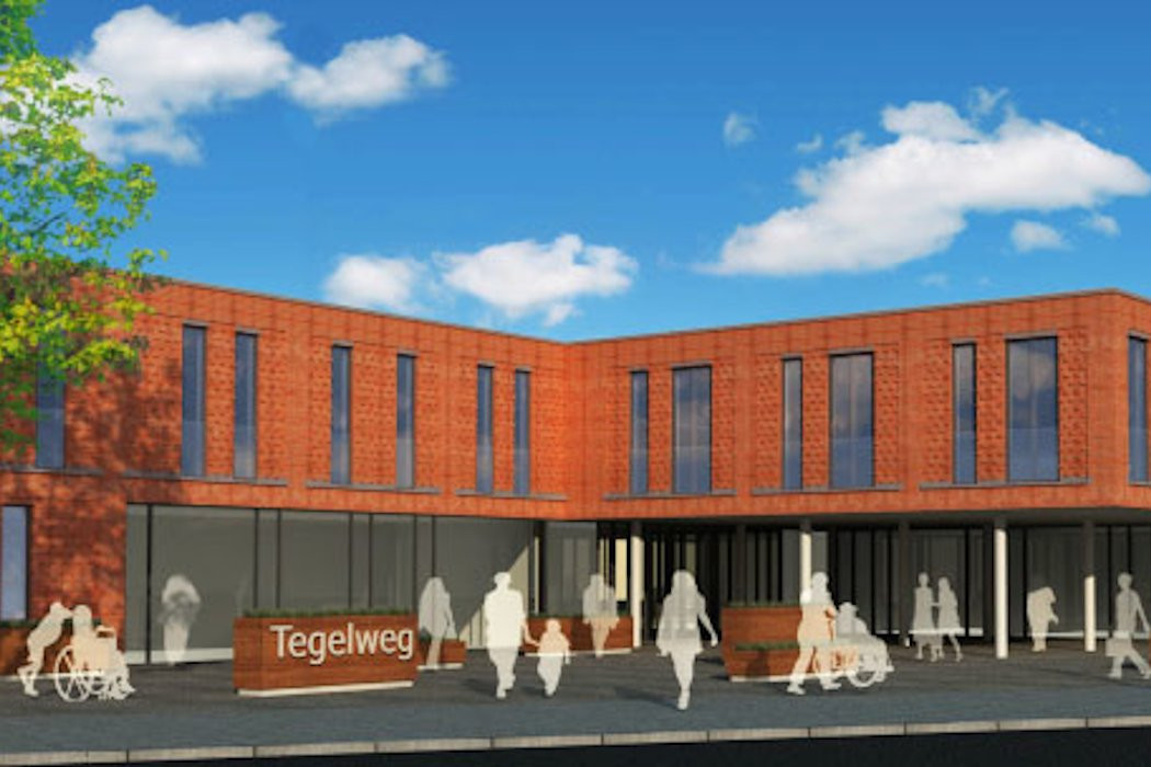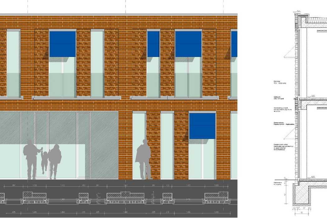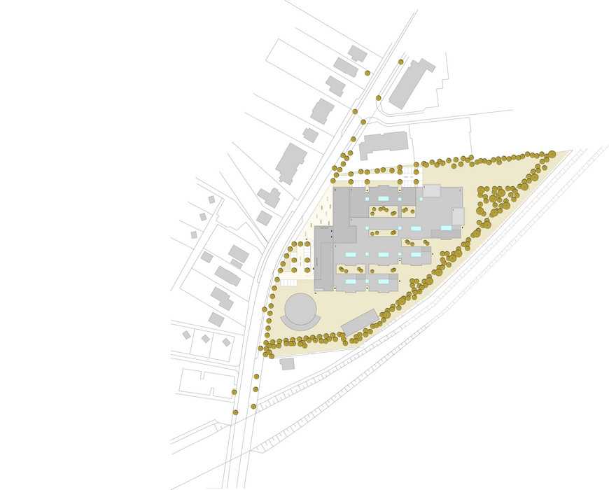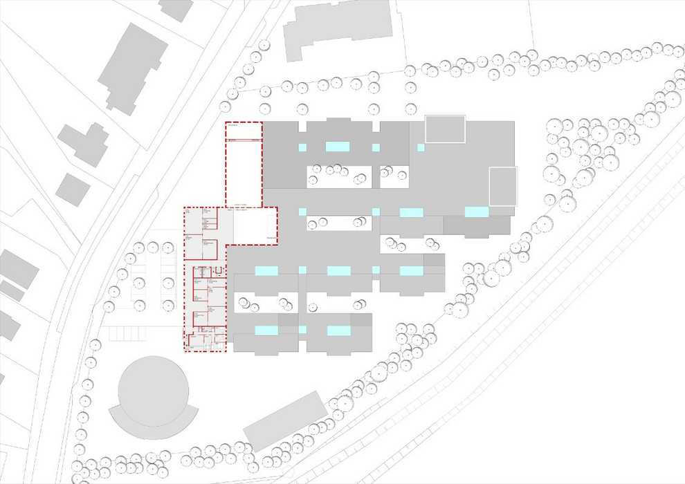 Der neue zweigeschossige Baukörper reagiert mit einem kräftigen Versatz auf den gekrümmten Straßenverlauf des Tegelweges und bildet dadurch einen großzügigen Vorplatz mit einem prägnanten, überdachten neuen Haupteingang aus.