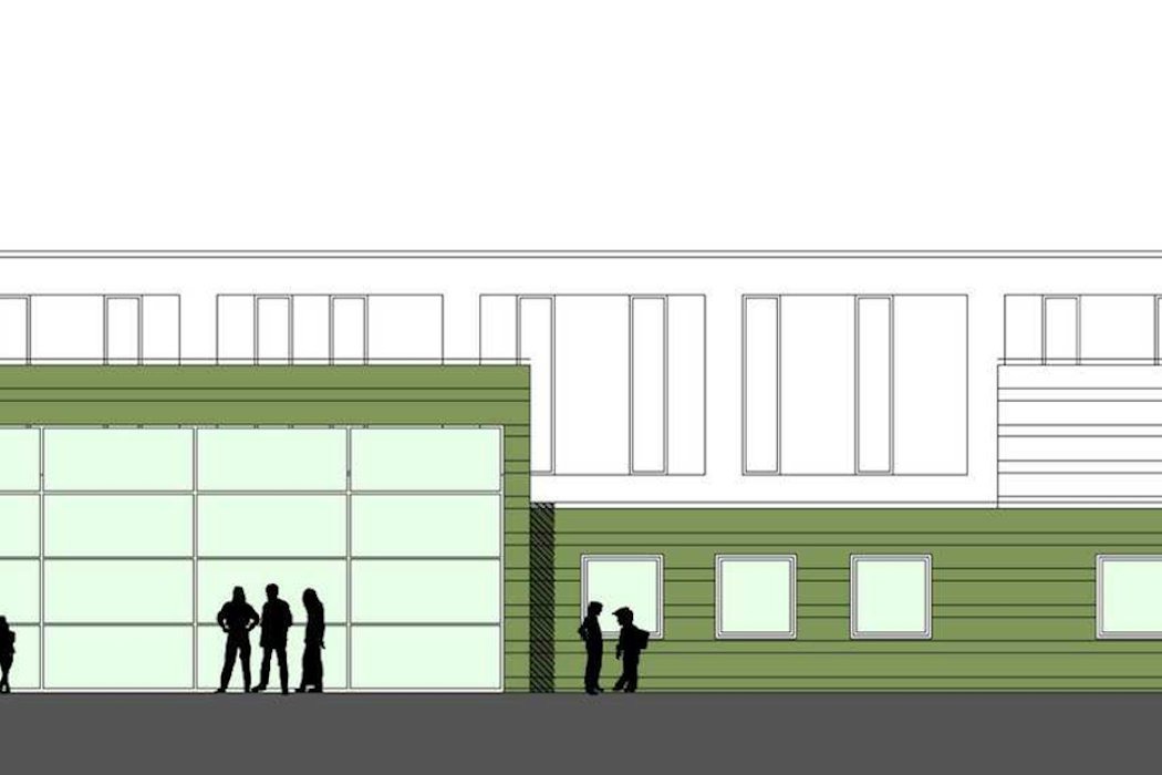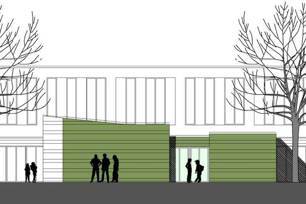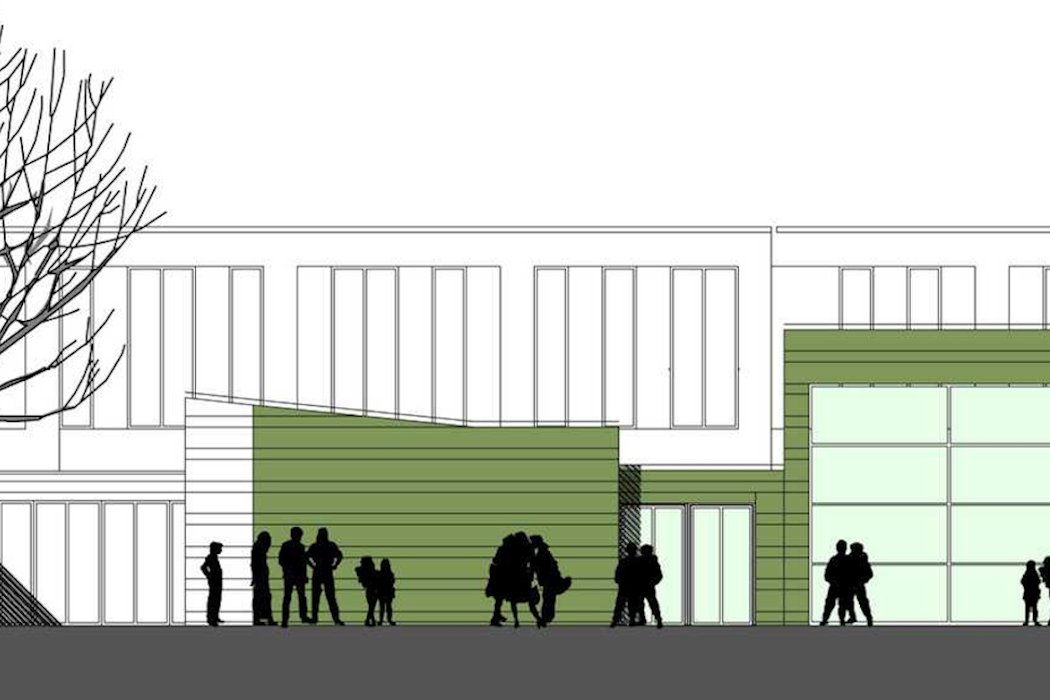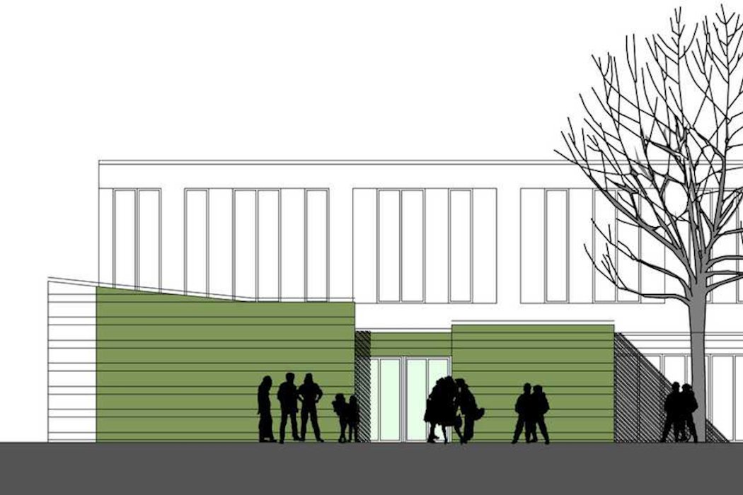 Der neue zweigeschossige Baukörper reagiert mit einem kräftigen Versatz auf den gekrümmten Straßenverlauf des Tegelweges und bildet dadurch einen großzügigen Vorplatz mit einem prägnanten, überdachten neuen Haupteingang aus.