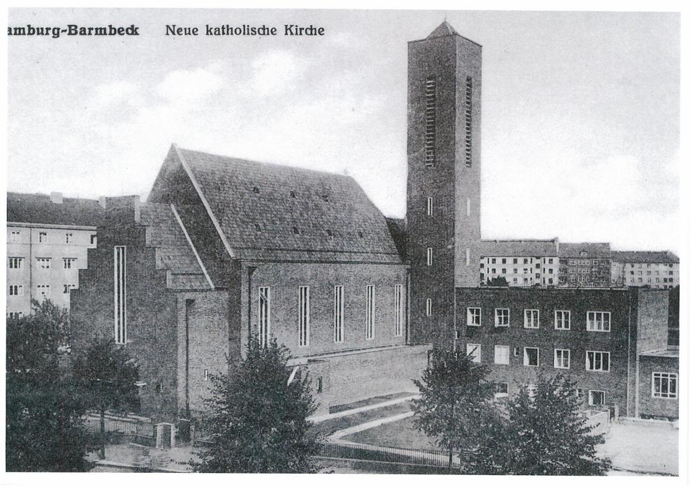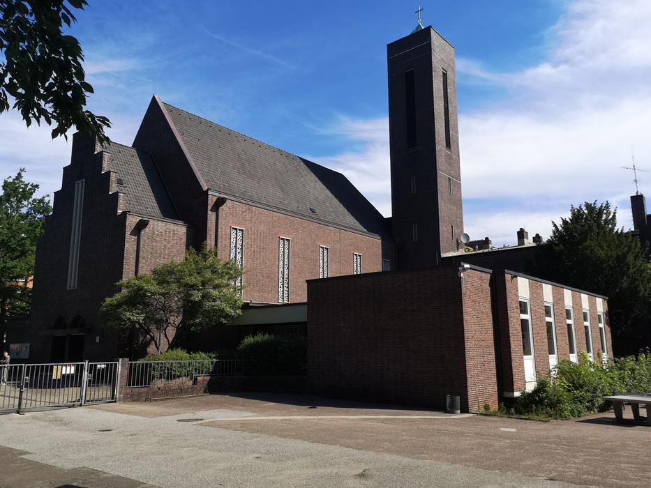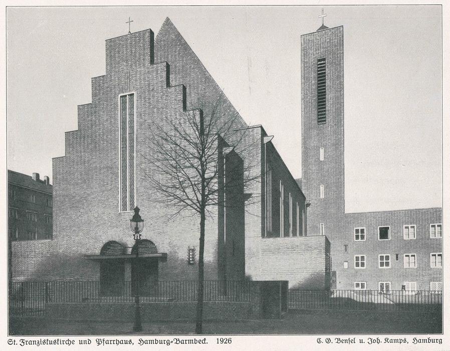 Die Franziskuskirche wurde 1926-27 von Bensel und Kamps gebaut. In ihrer Fassadensprache mit Treppengiebeln, Schmiedeeisengittern und Klinkerzierrat ist sie noch deutlich im Expressionismus verortet. Durch mehrere Bomben 1944 stark getroffen, wurde sie nur notdürftig geflickt. Der Turm wurde erst 9 Jahre später neu gedeckt.