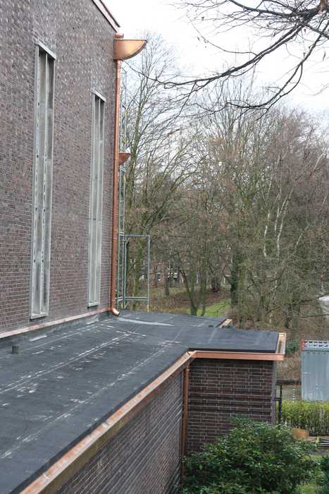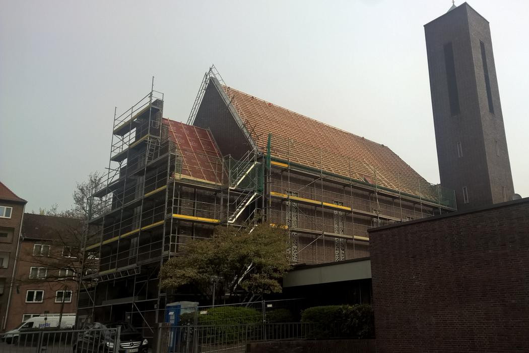 Das Pfannendach der Kirche musste aufgrund von vielen Leckagen erneuert werden. Die Flachdächer sind in den späten 80er Jahren mit Flüssigkunststoff abgedichtet worden und ebenfalls ein Sanierungsfall. Im Zuge der Sanierung der Dächer wurde besonderer Wert auf die originalen, expressiven Entwässerungselemente gelegt.