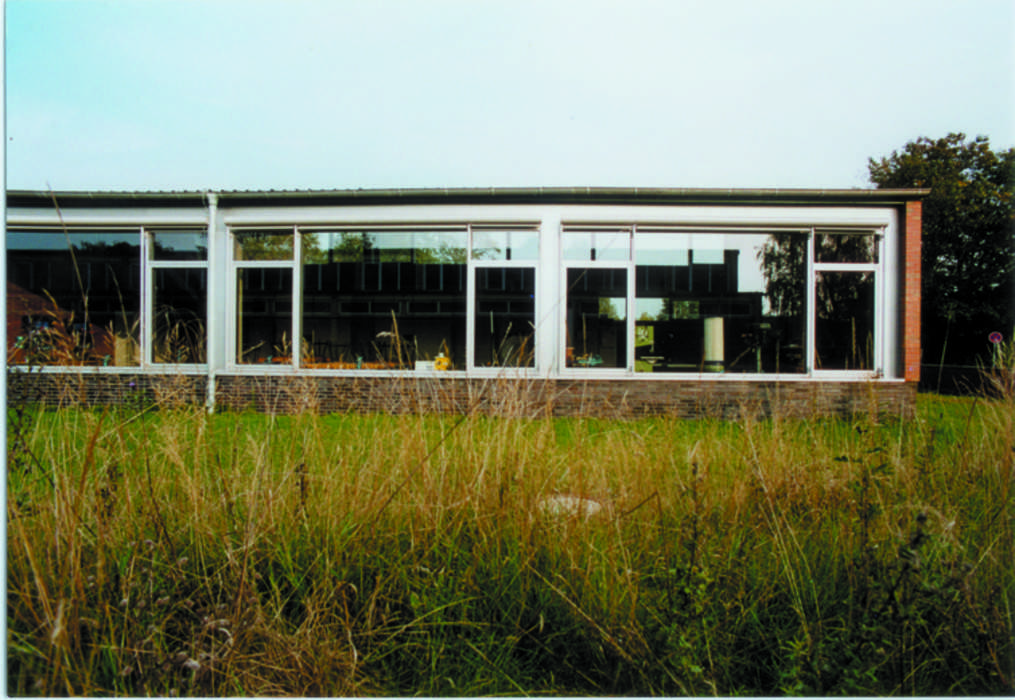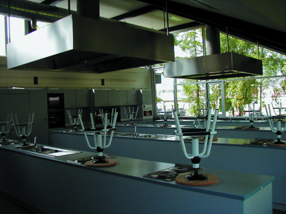 Die Lehrküche wurde dabei grunderneuert. Der Altbau wurde auf seine Tragstruktur aus Stahlbindern und gemauerten Wänden zurückgeführt. Dach und Fassaden waren nach vielen Reparaturzyklen abgängig.
