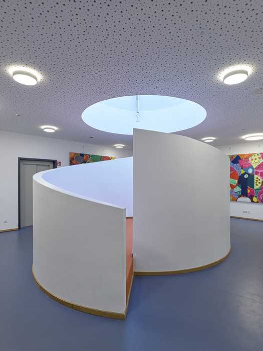 Im Obergeschoss umschließen weitere Klassen- und Fachräume einen zentralen Chillbereich in Form eines schneckenartig umschlossenen Podestes mit einem klaren Oberlicht, das den Blick in den Himmel freigibt.