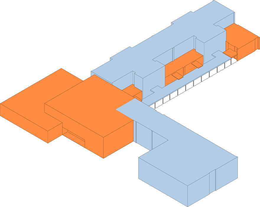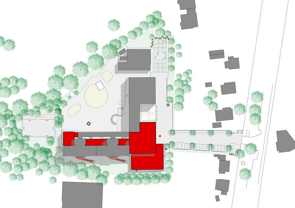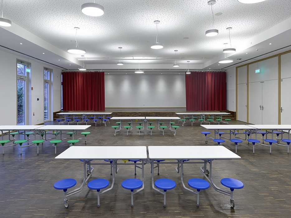Am Kreuzungspunkt beider Achsen ist in einem kompakten Baukörper „das Forum“ in Form von Pausenhalle und Aula angesiedelt.