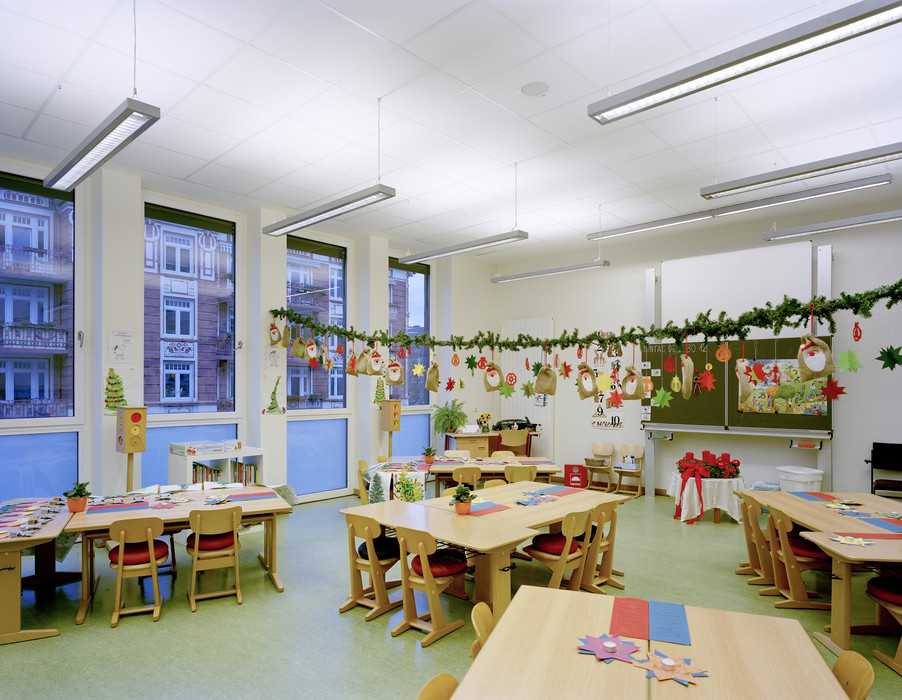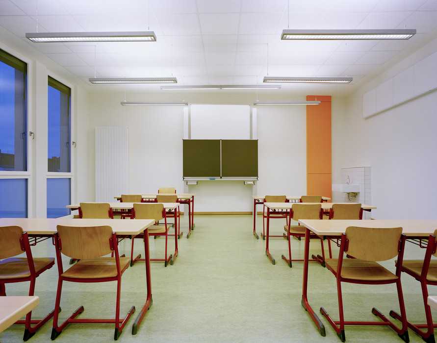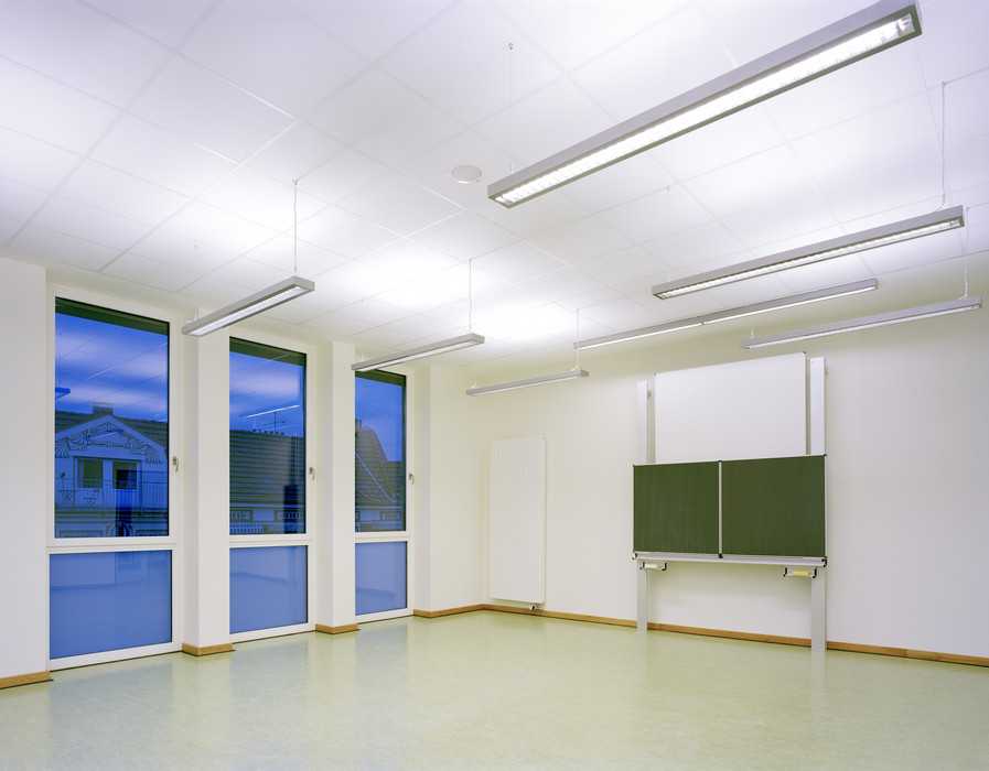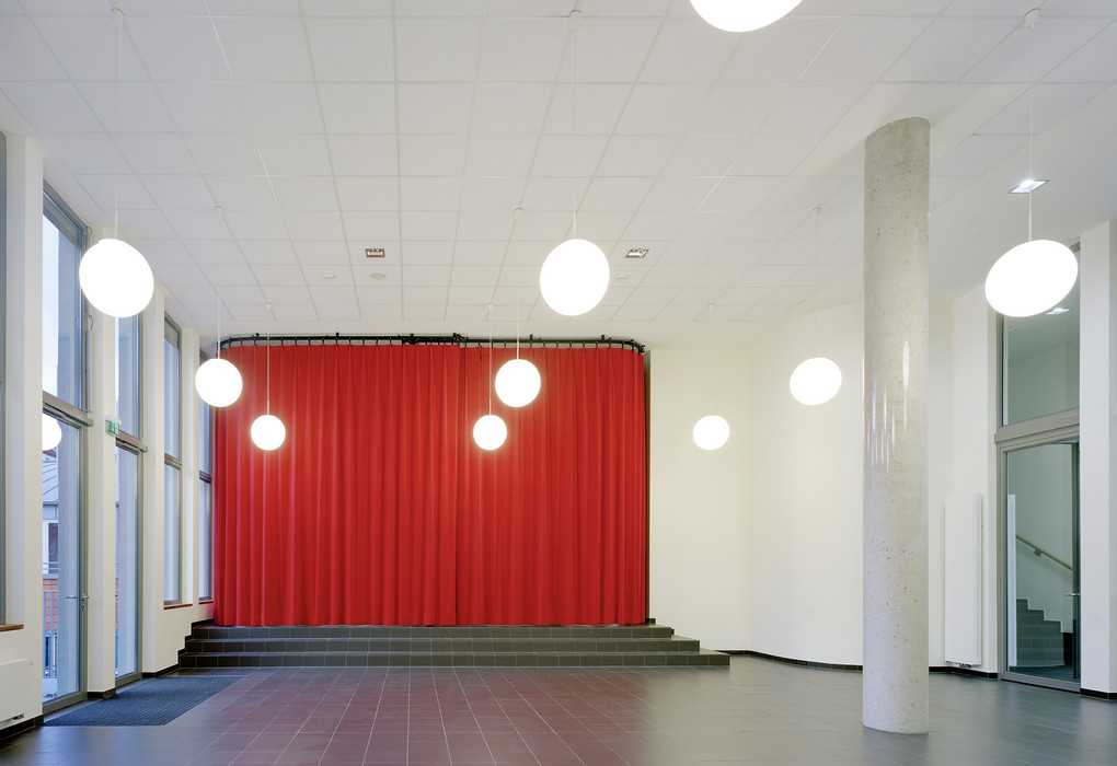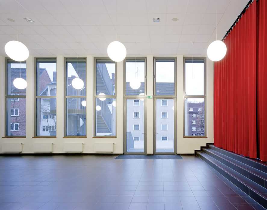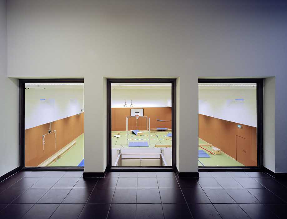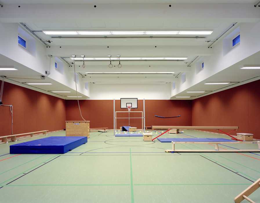 Im Untergeschoss ist eine Einfeldturnhalle mit den erforderlichen Nebenräumen untergebracht. Die Obergeschosse sind den Klassen mit den angeschlossenen Gruppenräumen vorbehalten.