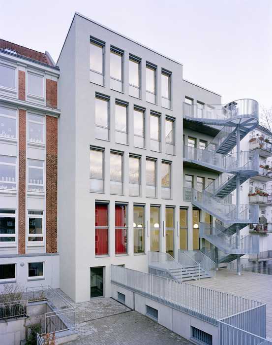 Mit der viergeschossigen Erweiterung der Grundschule wird der Blockrand geschlossen und ein neuer Haupteingang zur Schule mit einem Mehrzweckraum im EG formuliert.
