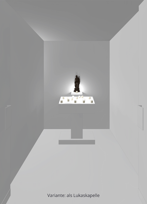 Die Katholische Kirche Sankt Lukas & Sankt Josef in Neubrandenburg, entworfen durch Der Vorentwurf stammt von Dietrich Otte, Erhard Russow & Ulrich Müter, ist als Denkmal gelistet. Im April 2024 wurden wir um eine Stellungnahme zu Umbaumaßnahmen in der Kirche sowie zur Ortsfindung für ein Trauerpastoral gebeten, wobei wir zu den jeweiligen Fragestellungen verschiedene Varianten entwickelt haben. Der Eingangsbereich soll barrierefrei umgestaltet werden, wofür der Einbau eines Aufzuges notwendig ist. In der vom Verfasser bevorzugten Variante ließen sich über die Zusammenfassung des Aufzugsschachts mit anderen Baulichkeiten eine kleine „Lukaskapelle“ zur Andacht sowie ein Schaukasten für die Josefstatue schaffen.