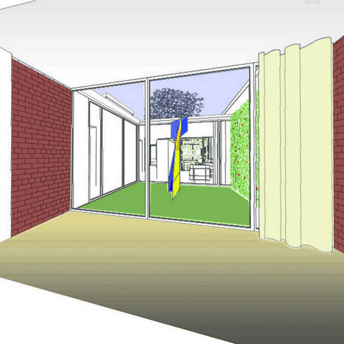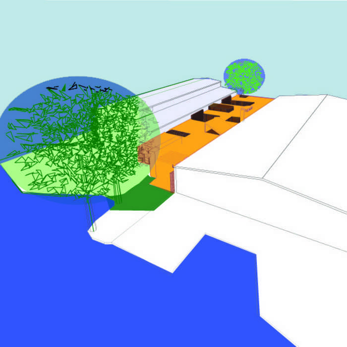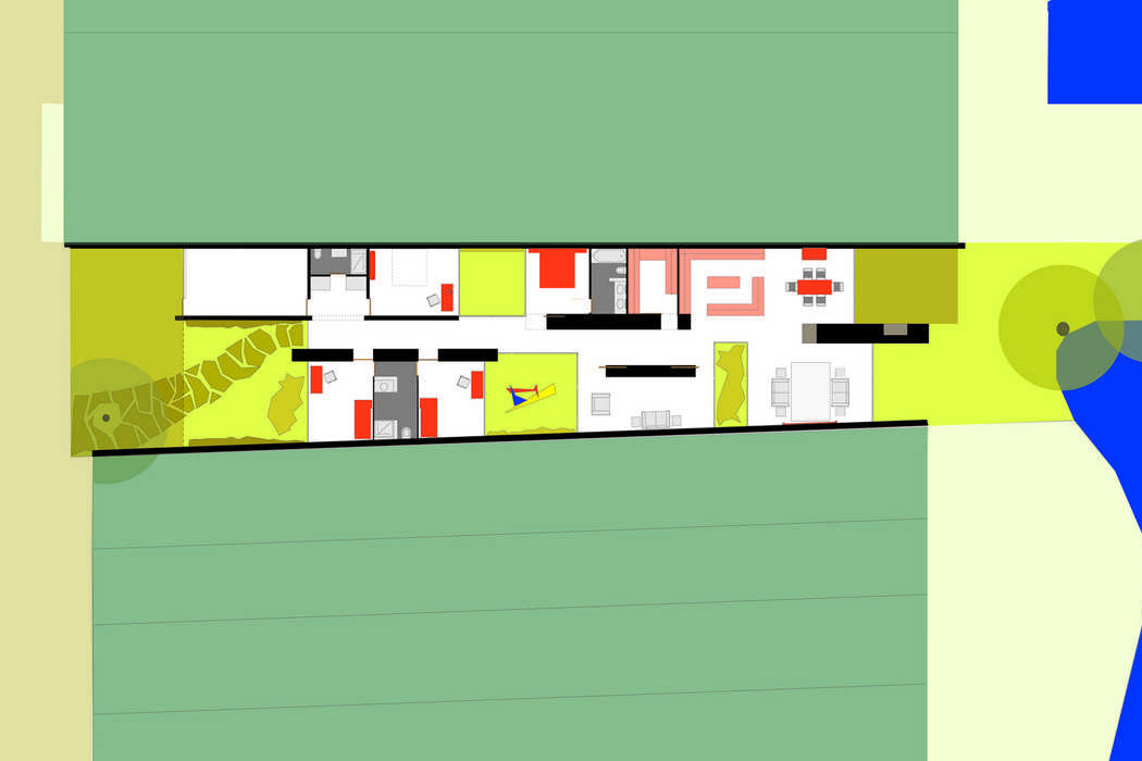 Das Grundstück ist in Hamburg an einem der vielen malerischen Fleete zwischen Bootschuppen gelegen. Es ist als Gewerbegrundstück mit eingeschossiger Bebauung ausgewiesen, jedoch mit seiner mittleren Breite von ca. 10 m als solches nicht sinnvoll nutzbar. Die angrenzenden Brandwände der benachbarten Bootsschuppen lassen eine konventionelle Nutzung nicht zu. Daher werden zur Belichtung und Belüftung des Hauses Innenhöfe gebildet, die dem Haus ein hohes Maß an Durchlässigkeit und Transparenz verleihen und die Grenzen zwischen Innen und Außen aufheben. Die Räume werden durch ein lebhaftes Spiel von Mauerscheiben von der Haupterschließung abgeschirmt. Der großzügige Wohn- und Essbereich öffnet sich zum Wasser.
