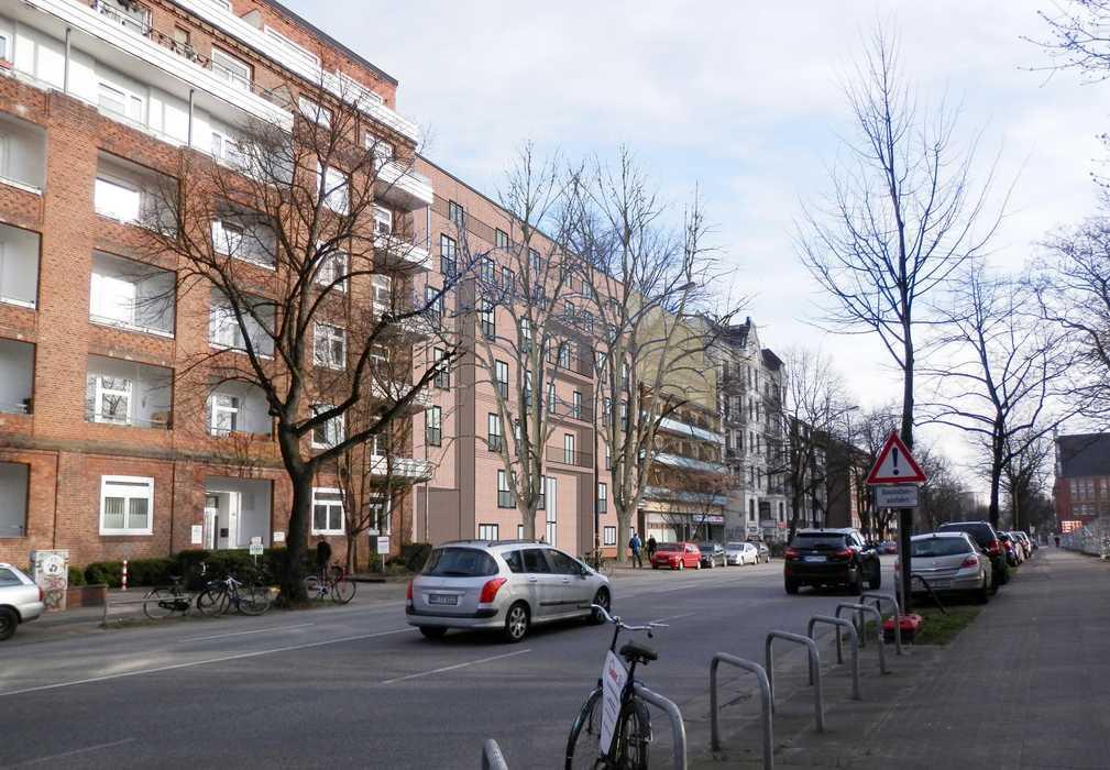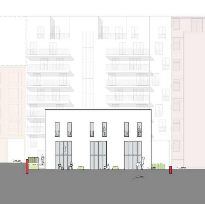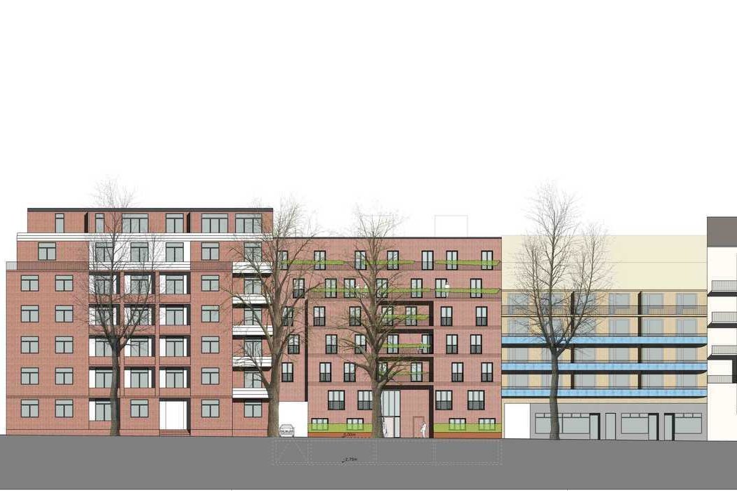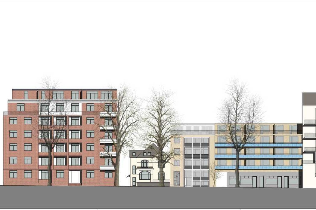 Mit dem Neubau wird der Blockrand 7-geschossig geschlossen. Die Fassade nimmt Motive und Gestaltungsprinzipien des bestehenden Eckhauses auf. Erd- und 1. Obergeschoss sollen als Büros genutzt werden. Die weiteren Obergeschosse sind dem Wohnen vorbehalten.