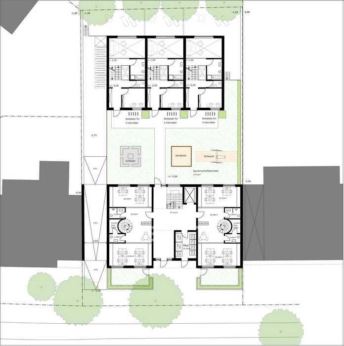 Im Hof sind drei Townhouses mit Split-Level-Grundrissen für Familien geplant. Während auf der Nordseite den Townhouses private Gartenbereiche zugeordnet sind, rundet eine Dachterrasse auf der Südseite das Angebot an Außenflächen ab.