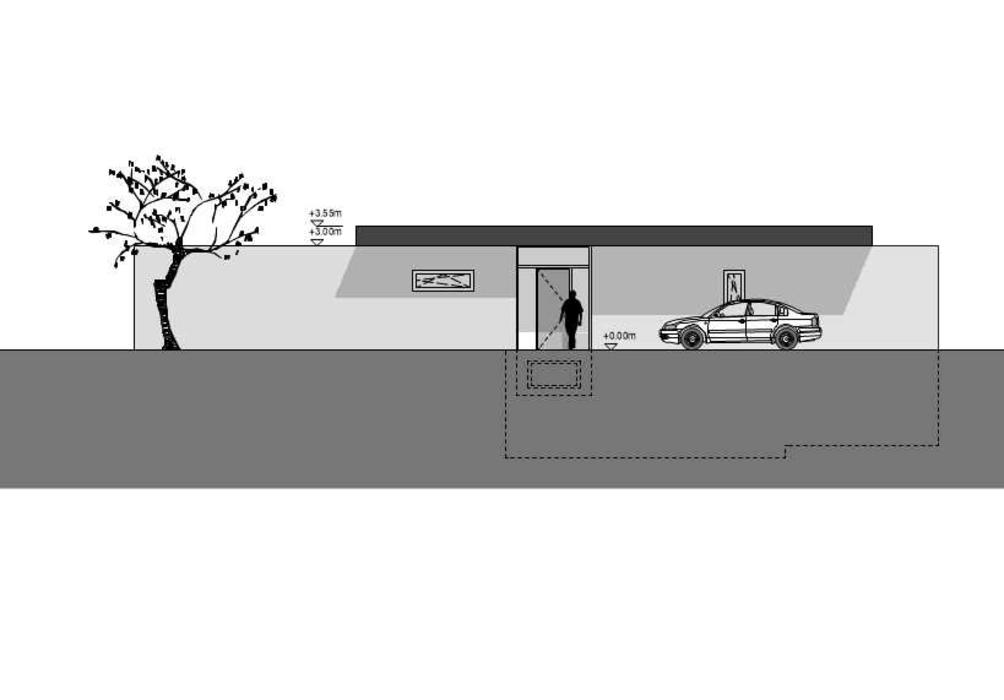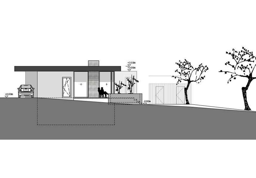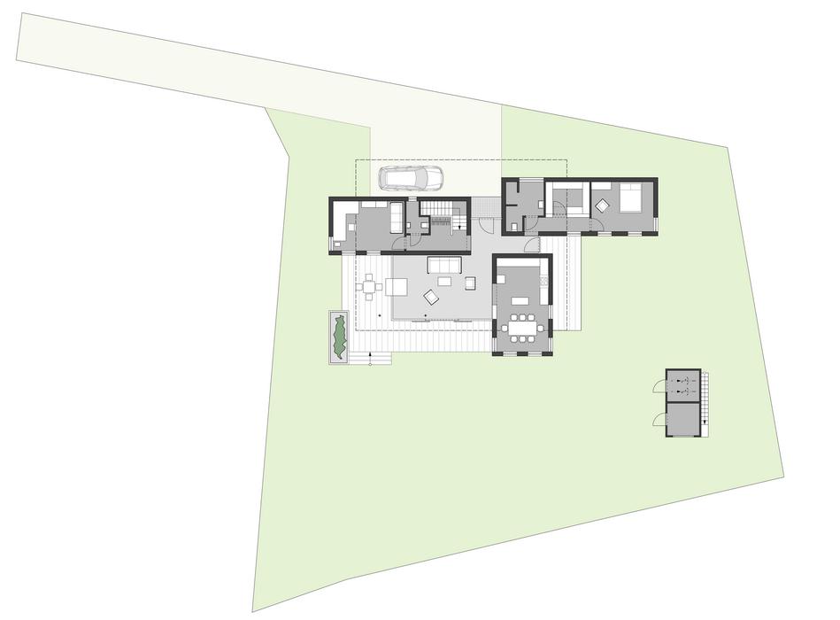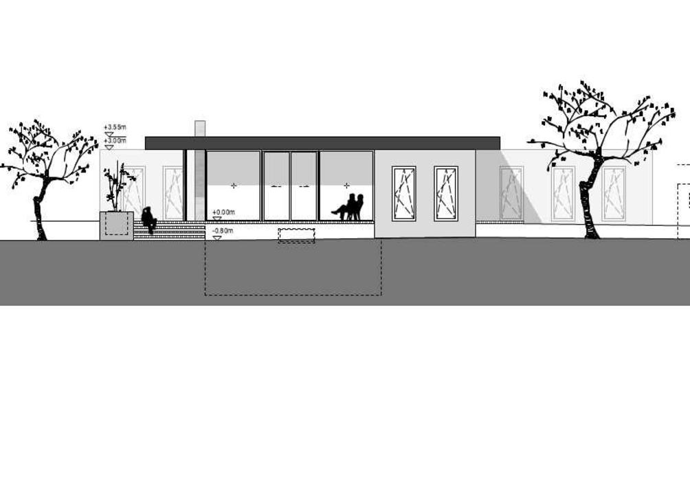 Das Grundstück liegt am Rande eines Naturschutzgebietes. Das vorgeschlagene eingeschossige Einfamilienhaus verbindet sich mit seinen drei Riegeln mit den Funktionsbereichen Arbeiten, Kochen und Schlafen und den dazwischen liegenden raumhoch verglasten Wohnbereichen auf ideale Weise mit dem Traumgrundstück am Rande eines Naturschutzgebietes in Reinbek.