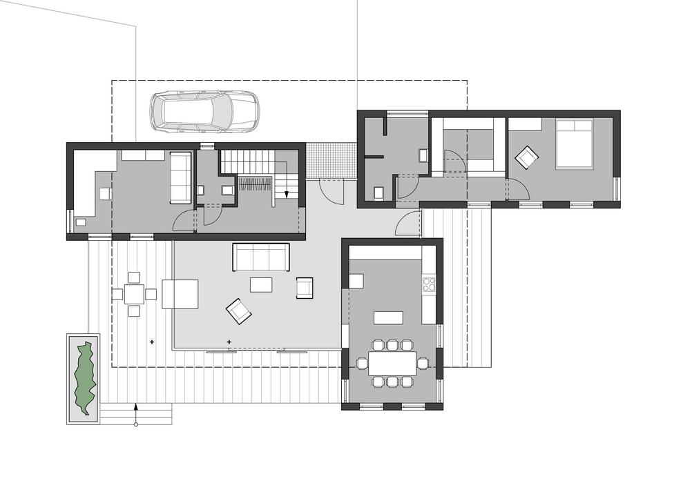 Über allen inneren und äußeren Wohnbereichen schwebt eine Flachdachscheibe, die gemeinsam mit der großen Terrasse die Grenze zwischen Innen und Außen aufhebt.